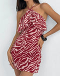 The halter mini dress in a red zebra print chiffon fabric. Featuring a handkerchief, halter neckline, complete with a flowy chiffon panel that drapes from the neck.
