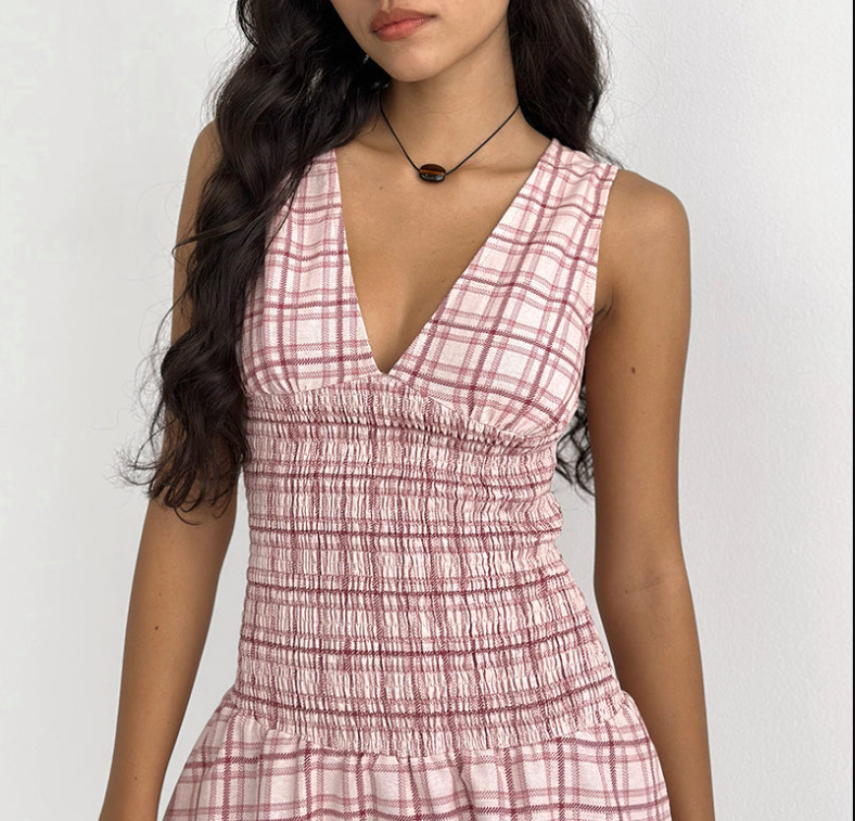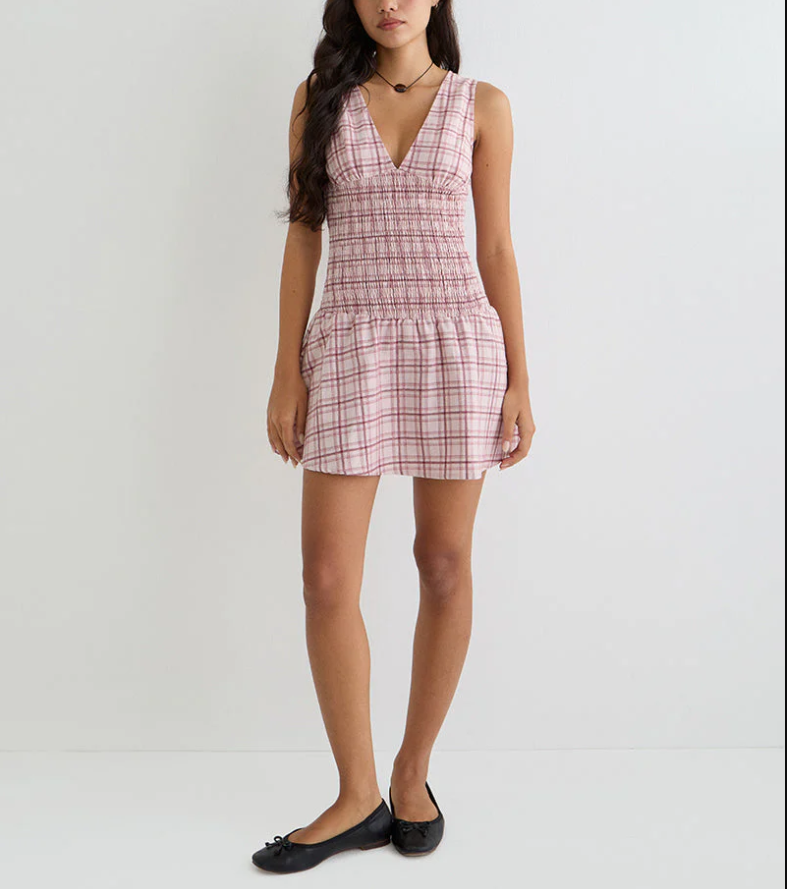 The dress in a pink basic tartan print. A mini style dress with V-neckline and thick straps, shirring on the bod